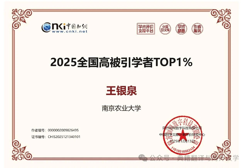 中国知网日前发布了“2025全国高被引学者”榜单,南京农业大学外国语学院王银泉教授再次入选外国语言文学一级学科高被引学者Top1%名单,这是他继入选“2024中国知网高被引学者”Top1%名单之后再次入选。