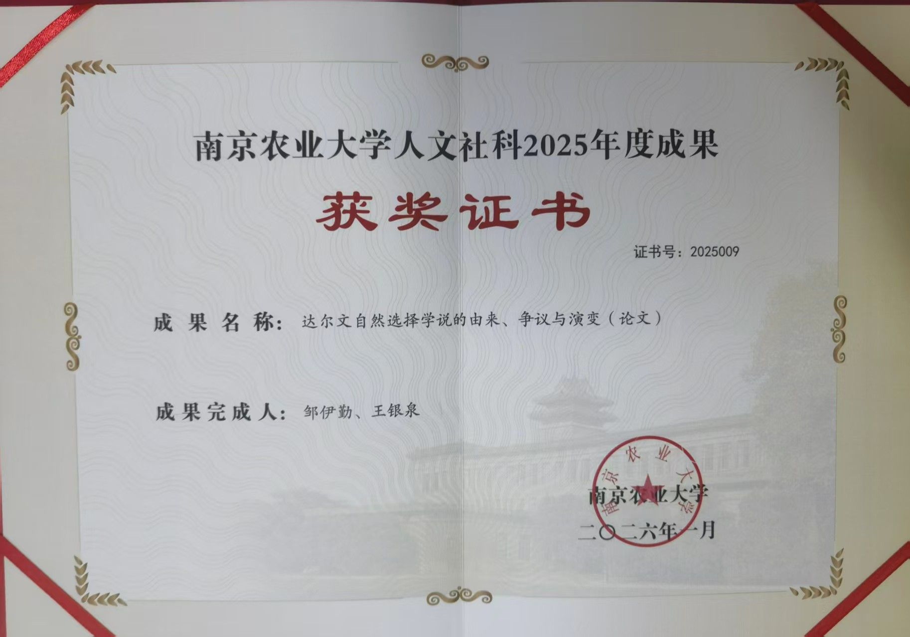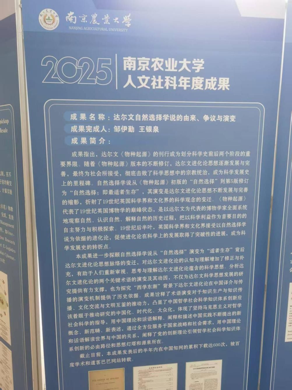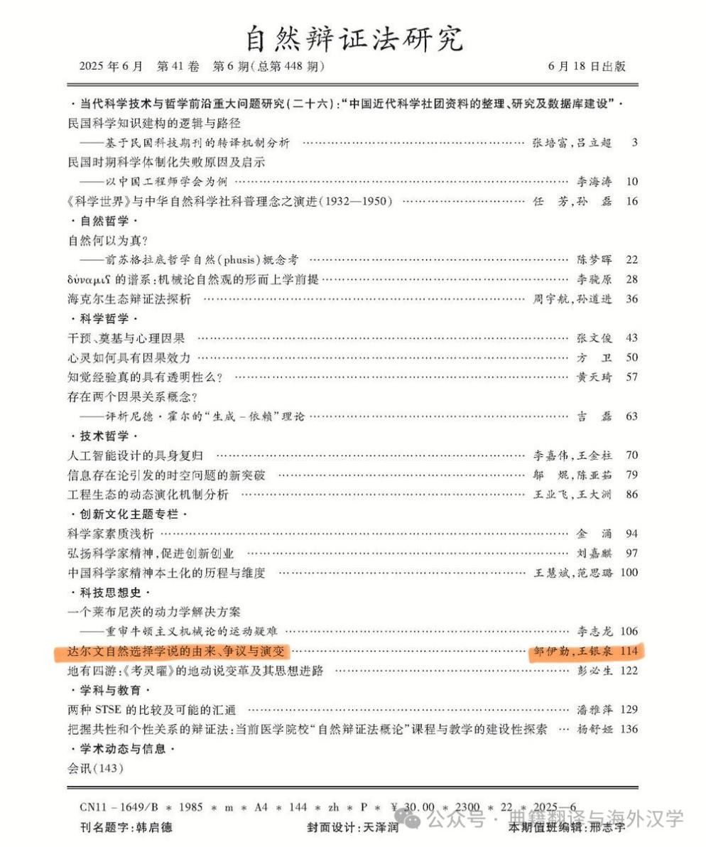 南京农业大学典籍翻译与海外汉学研究中心创始主任、南京农业大学外国语学院王银泉教授指导其博士生邹伊勤共同完成的论文《达尔文自然选择学说的由来、争议与演变》入选成果。该论文发表在南农高质量核心期刊一类期刊《自然辩证法研究》2025年第6期。